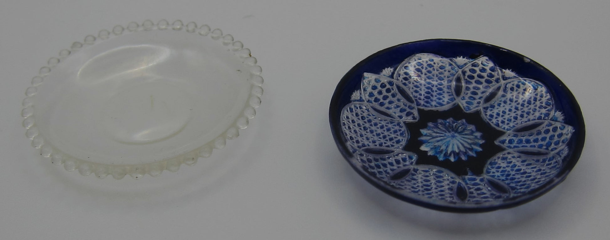1 clear plate and 1 blue plate with a design