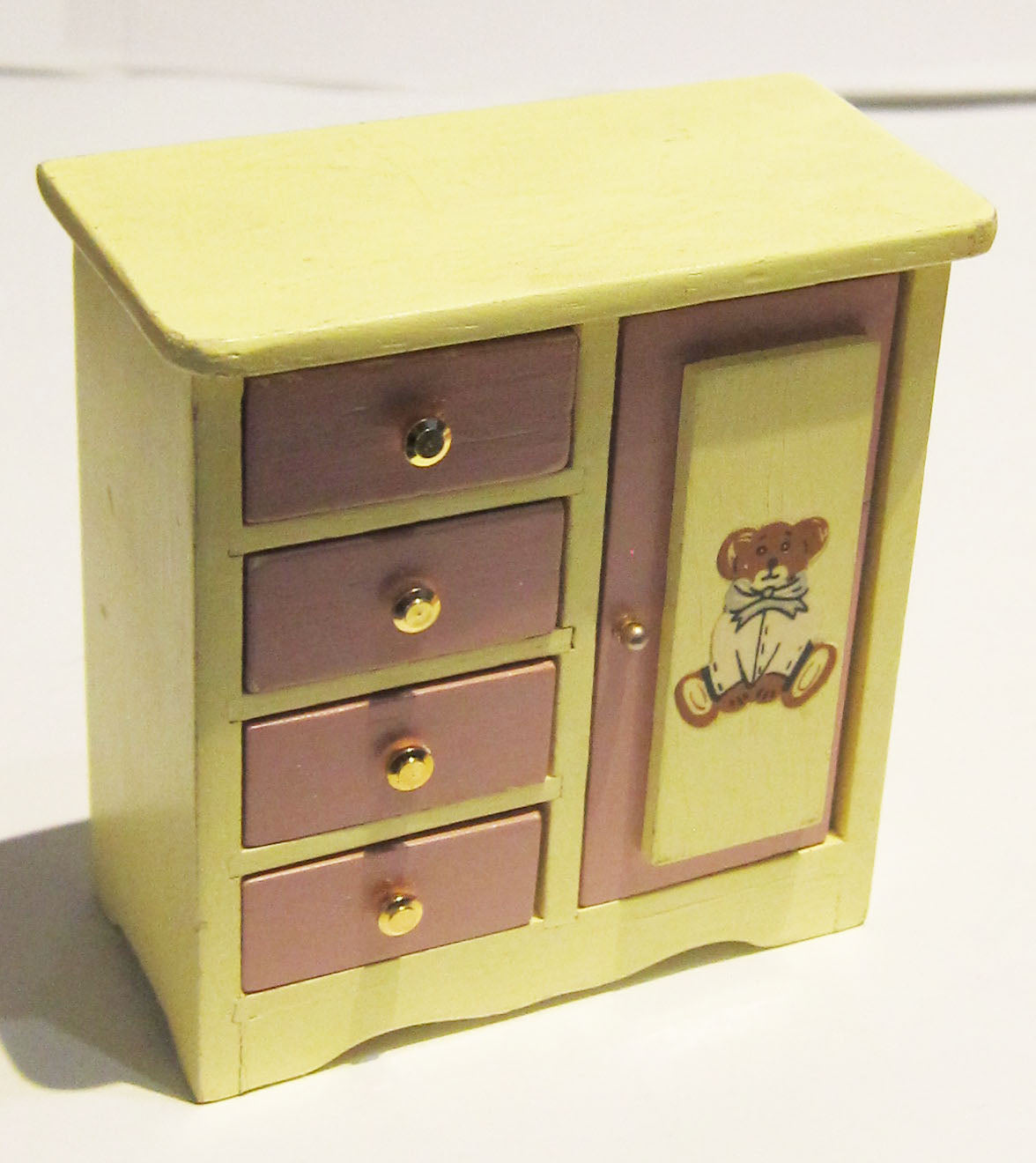 4 Drawer nursery cupboard, painted wood, 4 opening drawers, 1 opening door. Brass knobs.