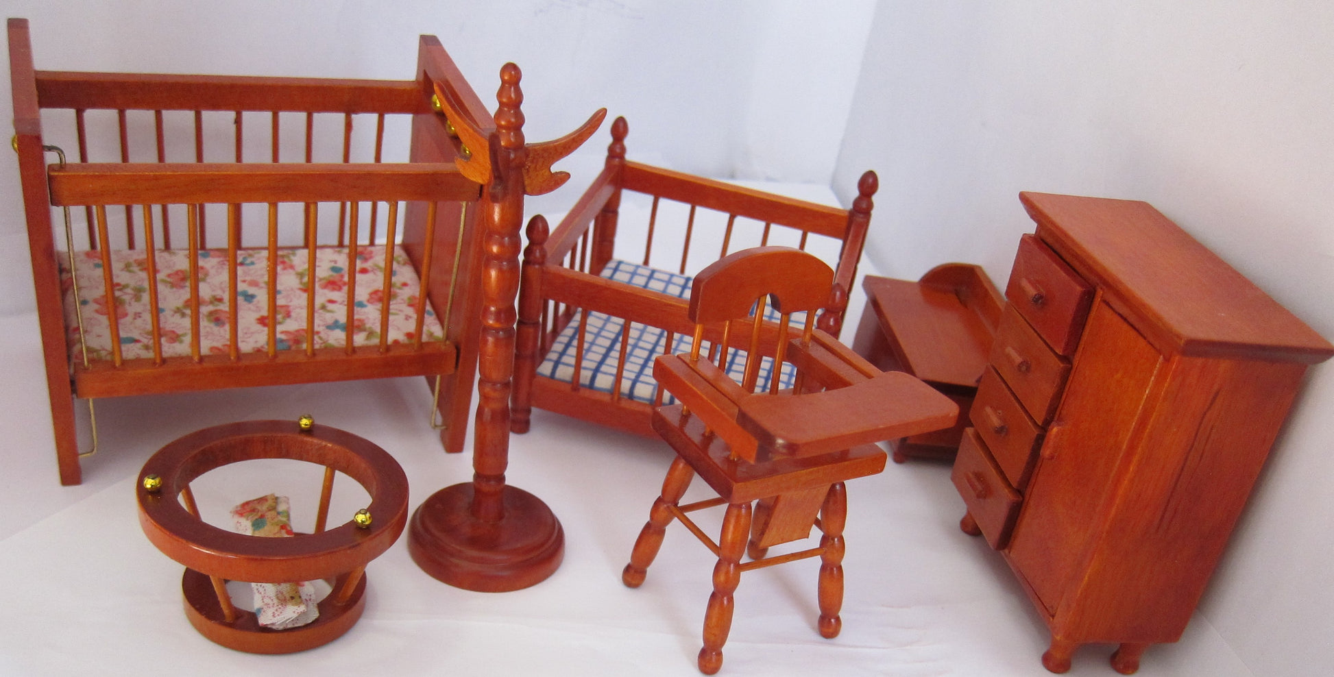 A drop-sided cot, playpen, high chair with a lift up flap, a baby walker, a dresser (with 4 drawers and 1 cupboard - all can be opened), a toy box (not opening) and a coat rack