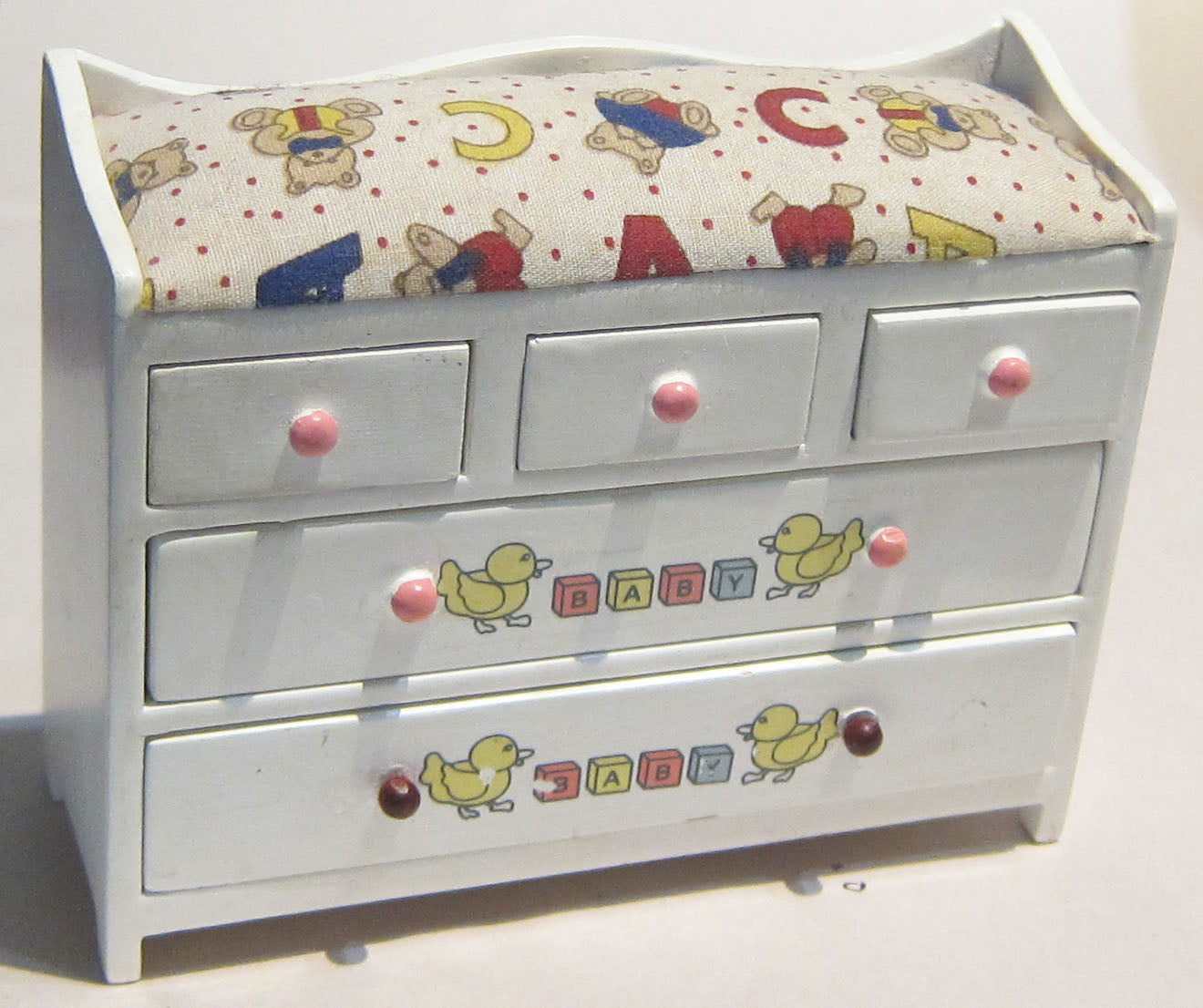 White, decorative nursery changing table with 5 x opening drawers, and 2 x nursery transfers on drawers with an ABC mattress