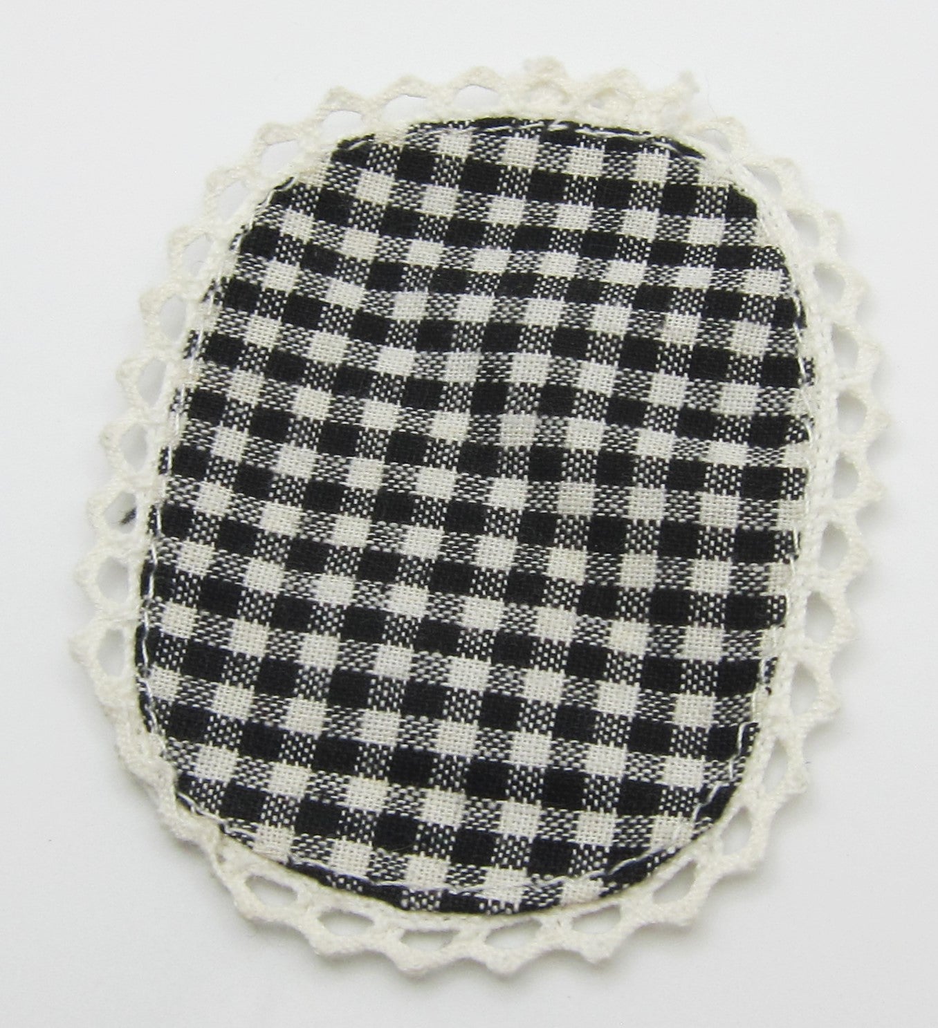 An oval, flannel-patterned (black & white) bathroom/kitchen mat with white lace around it.