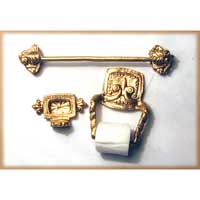 Bathroom Accessories, metal, gilt finish, towel rail, soap dish, toilet roll holder with roll.