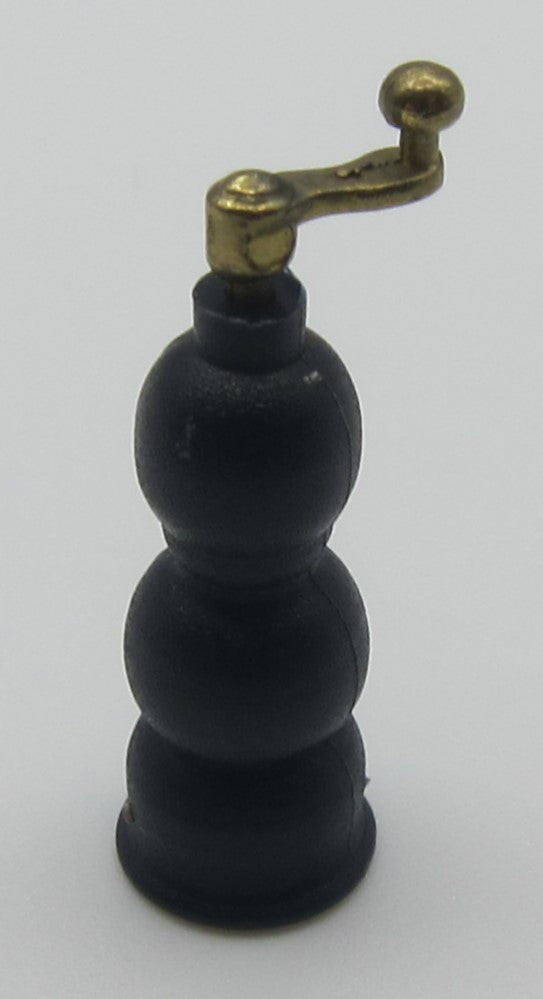 A black, wooden, pepper grinder with a gold-coloured handle. 3,5 cm Height