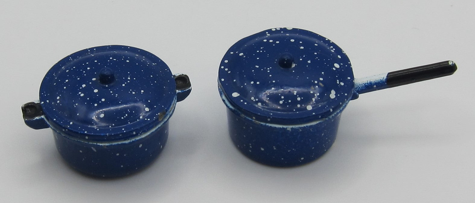 2 Blue, with white speckles, pots with white interiors. Different pot shapes: Pot with a long handle & a pot with 2 short handles. Each pot has a lid.