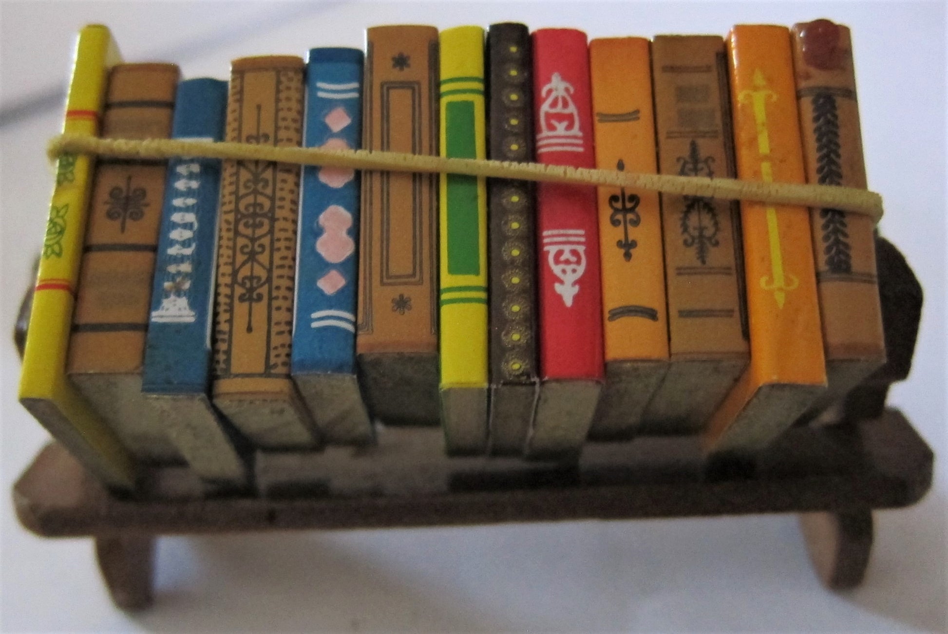 13 individual books on a wooden rack