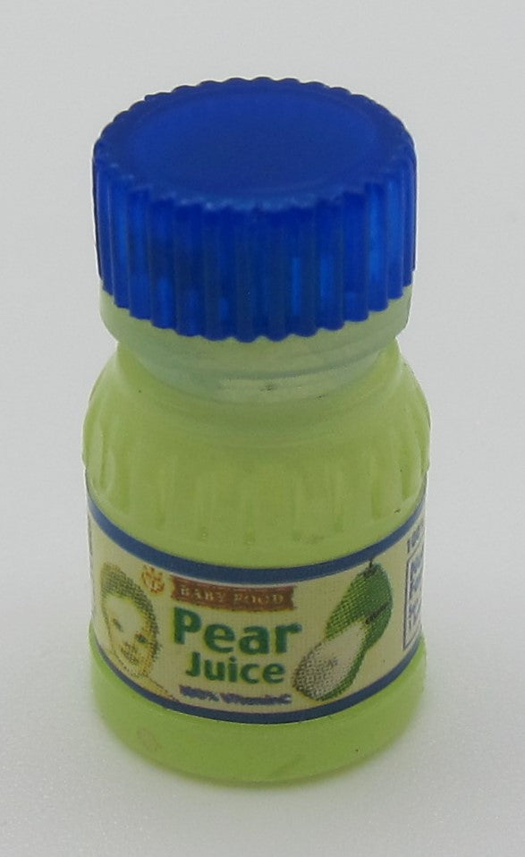 A plastic bottle of pear juice with a blue, screw-on lid. 2 cm Height
