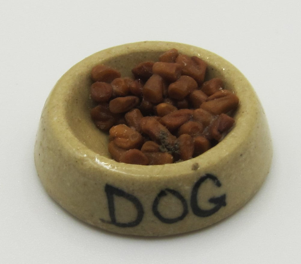 Light brown dog bowl filled with pellets. 2,6 cm Diameter