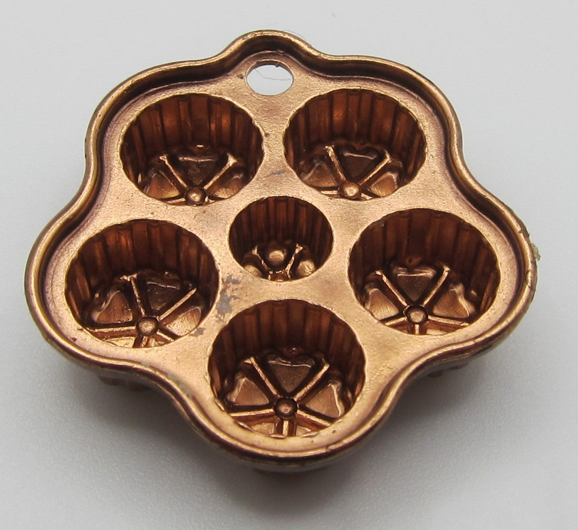 A pentagonal shaped bronze, metal cupcake mold. 5 normal & 1 smaller sized cupcake mold. Can be hung up. 3,1 cm length 0,6 cm height/width