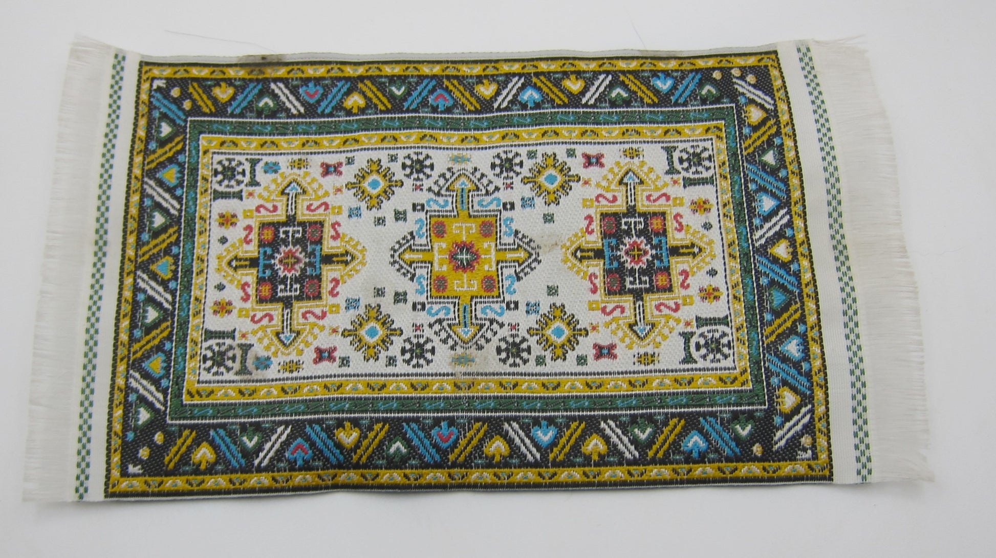 A blue, green and yellow coloured carpet decorated with spades, arrows and checkered patterns. 17,5 by 10 cm