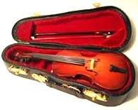 Brass cello with bow in a black imitation leatherette case lined in red velvet.