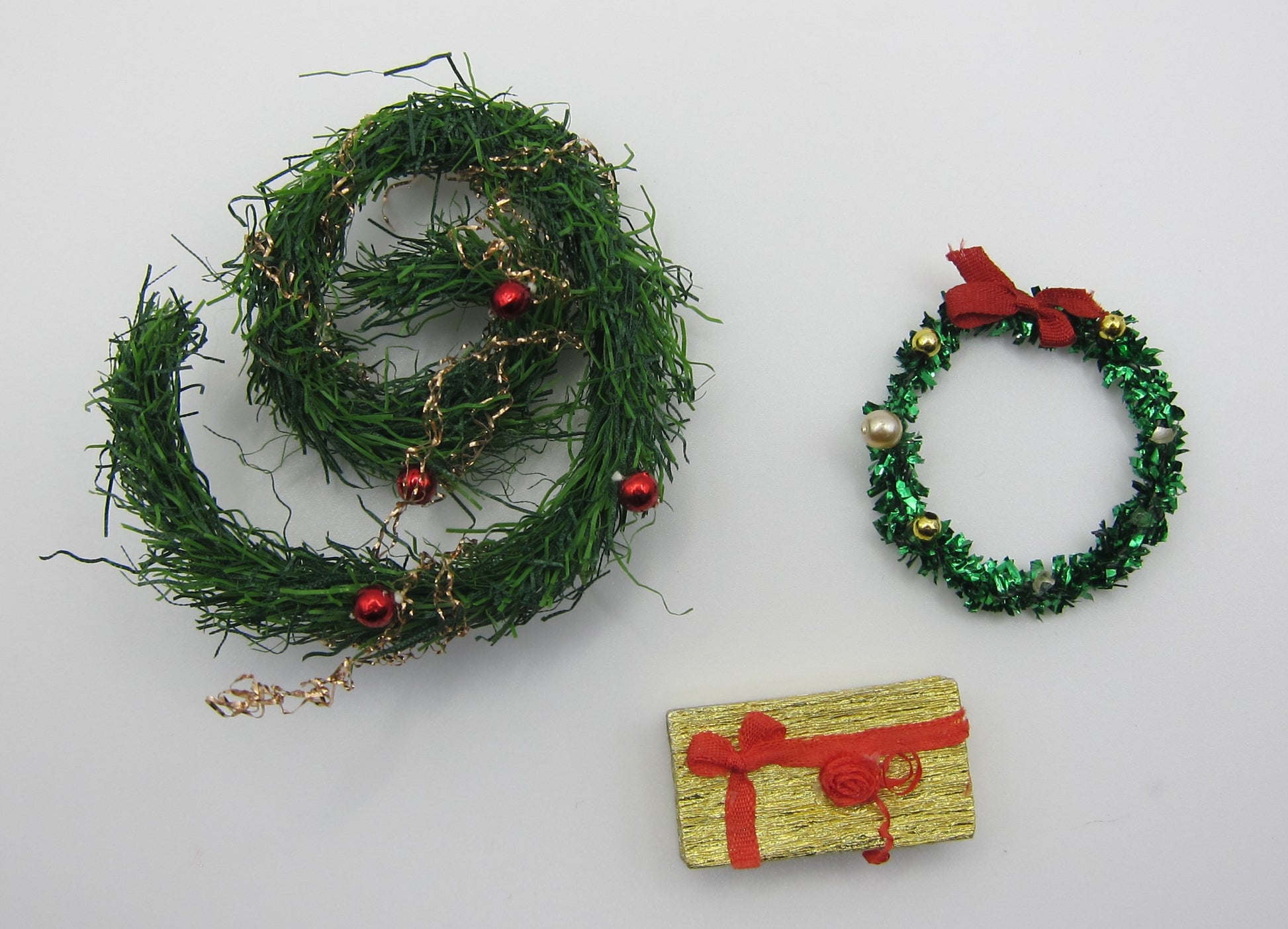 A Christmas wreath, greens tinsel & a golden wrapped present