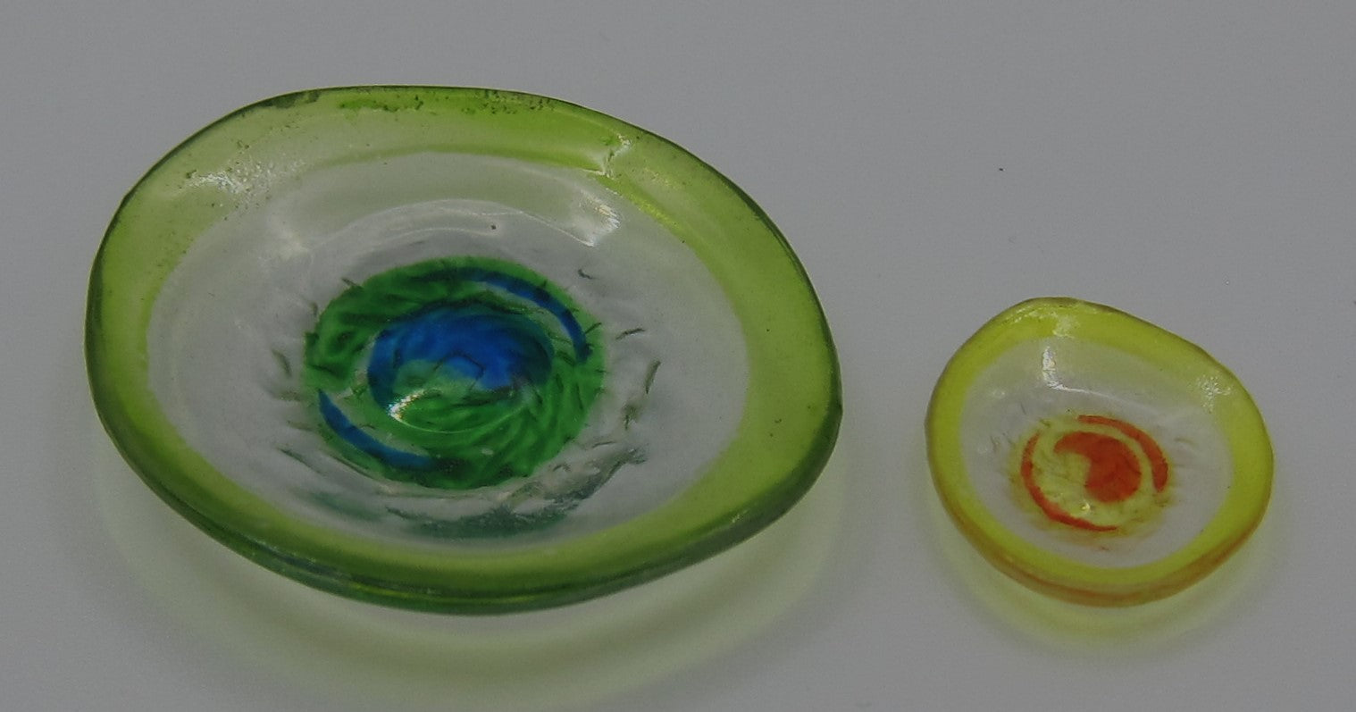 A small, colorful plastic-glass plate. 1,9 cm Diameter