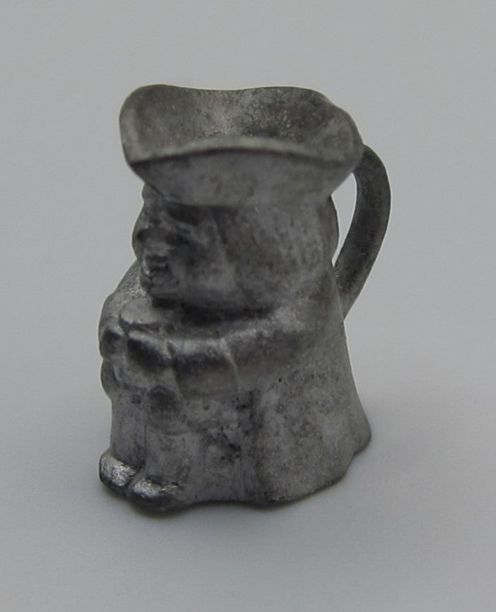 Solid, silver-coloured milk jug with a face on it. 1,6 cm Height