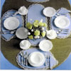 Dinnerware and Silverware Settings, plastic, 1/12th scale, 4 sets, dinner plates, bread plates, cereal bowls, saucers, cups, knives, salad forks, soup spoons, tea spoons.