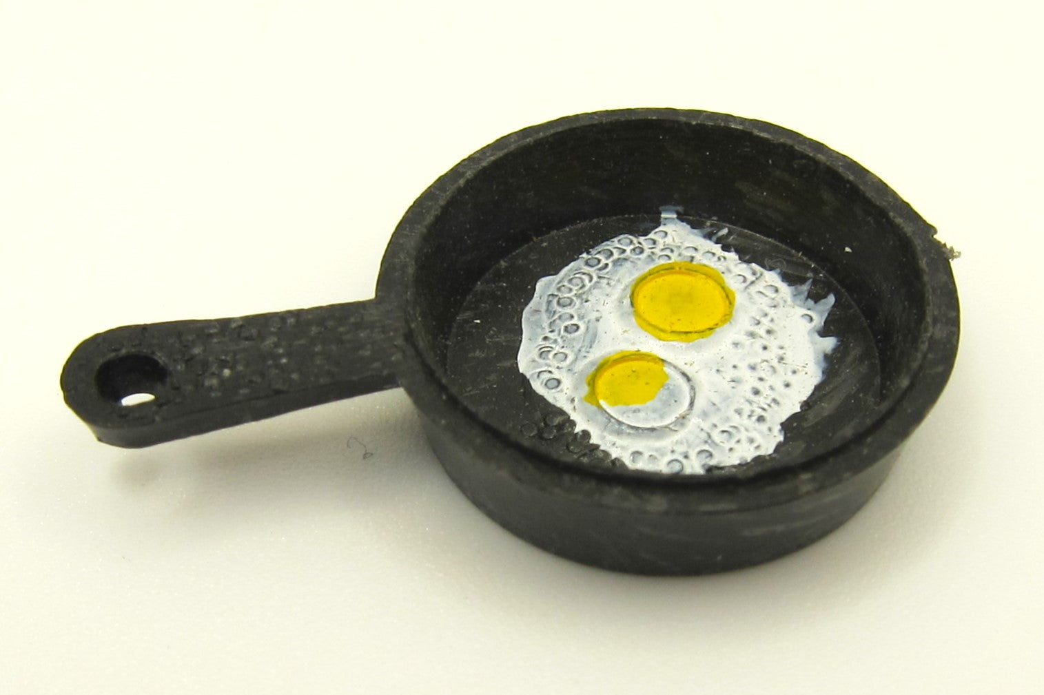 Black frying pan with two fried eggs. 3 cm Length 1,9 cm Width