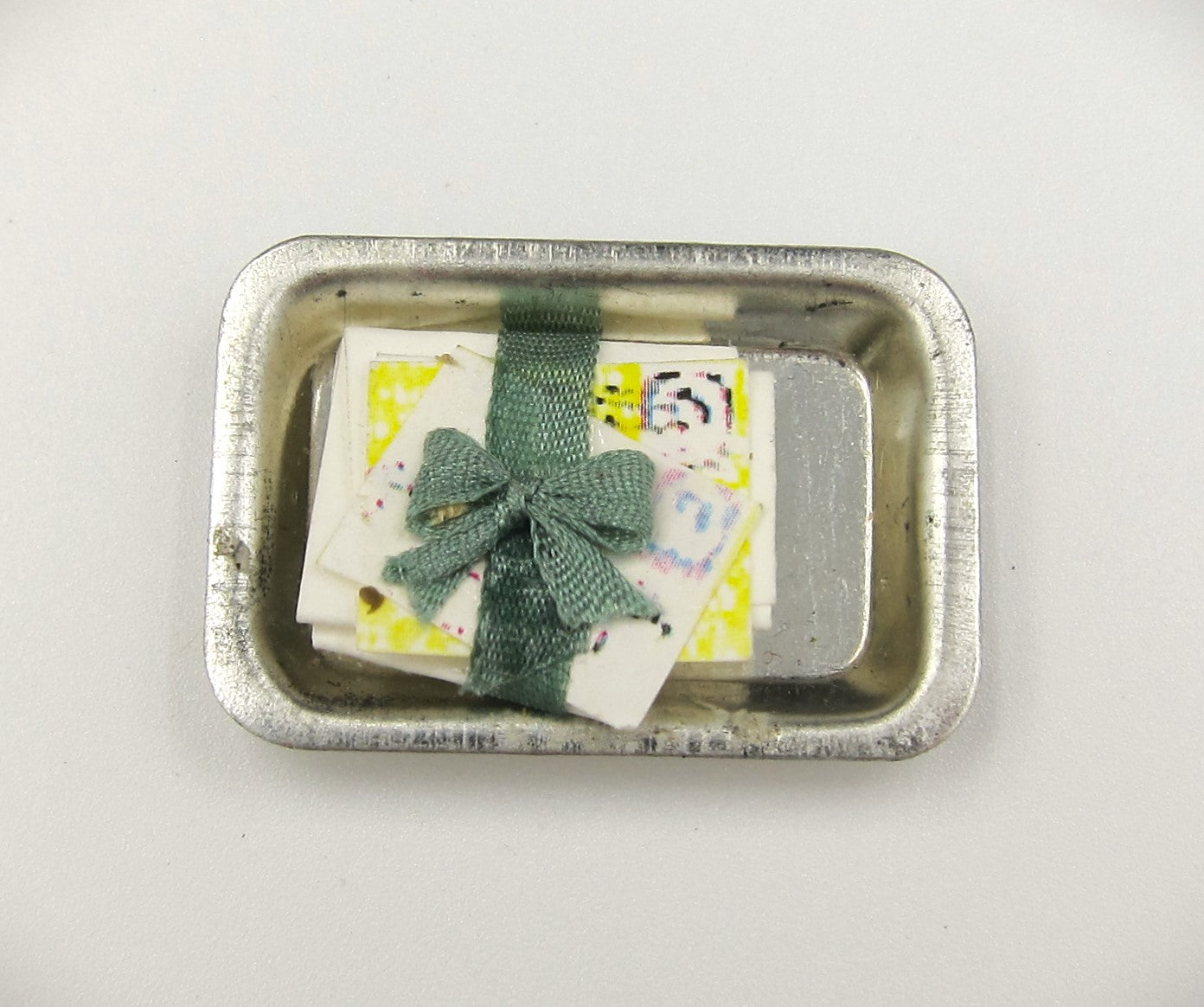Silver Envelope carrier with a stack of Letters decorated with a Green Ribbon.