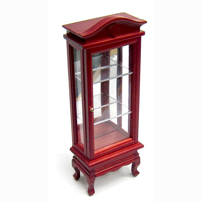 Display Cabinet, wood, shell motive at top, mirror back, 2 Perspex shelves, opening glazed door, light Mahogany, 17 cm h x 6 cm w.