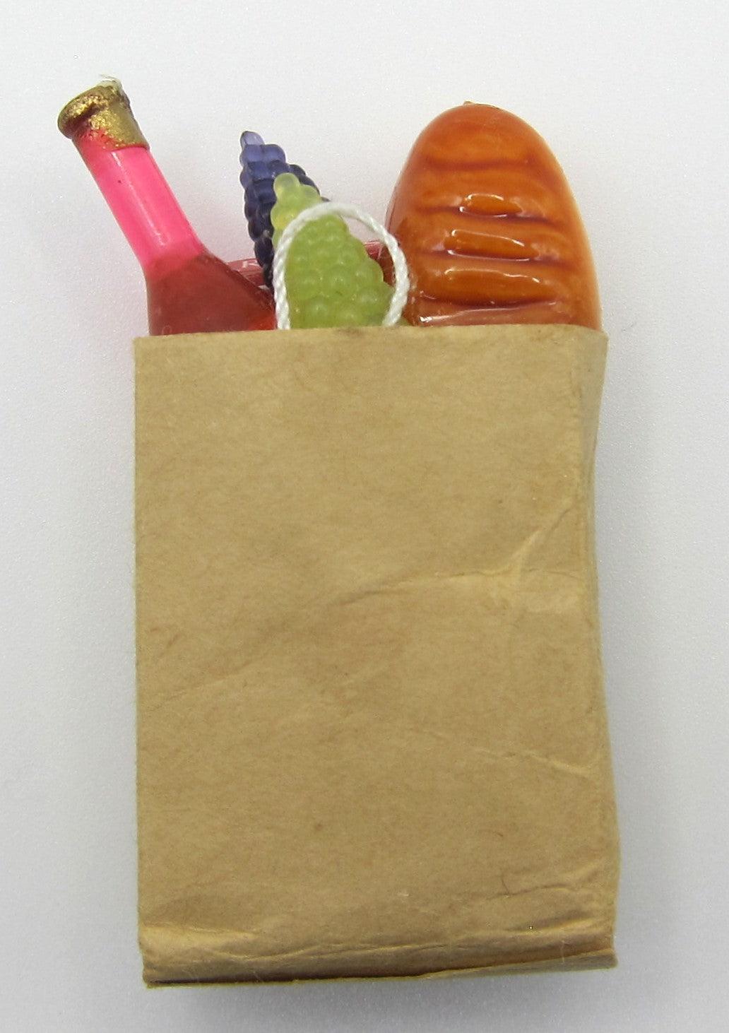 Paper bag filled with groceries. 5,5 cm Height 2,7 cm Width 1,2 cm Breadth