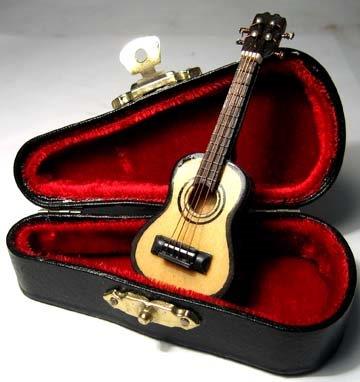 Wood and plastic guitar with a black imitation leatherette case lined in red velvet.