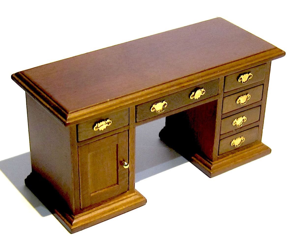 Knee Hole Desk. Walnut, 6 opening drawers, 1 opening door.