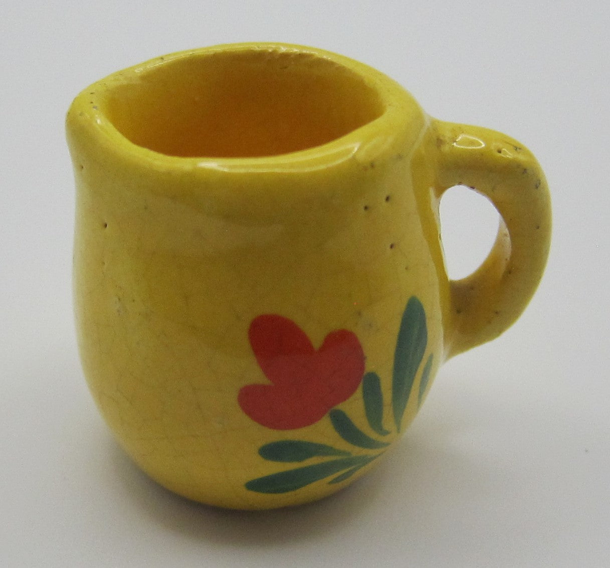 A ceramic, yellow, large jug decorated with painted flowers. Has a spout & handle.