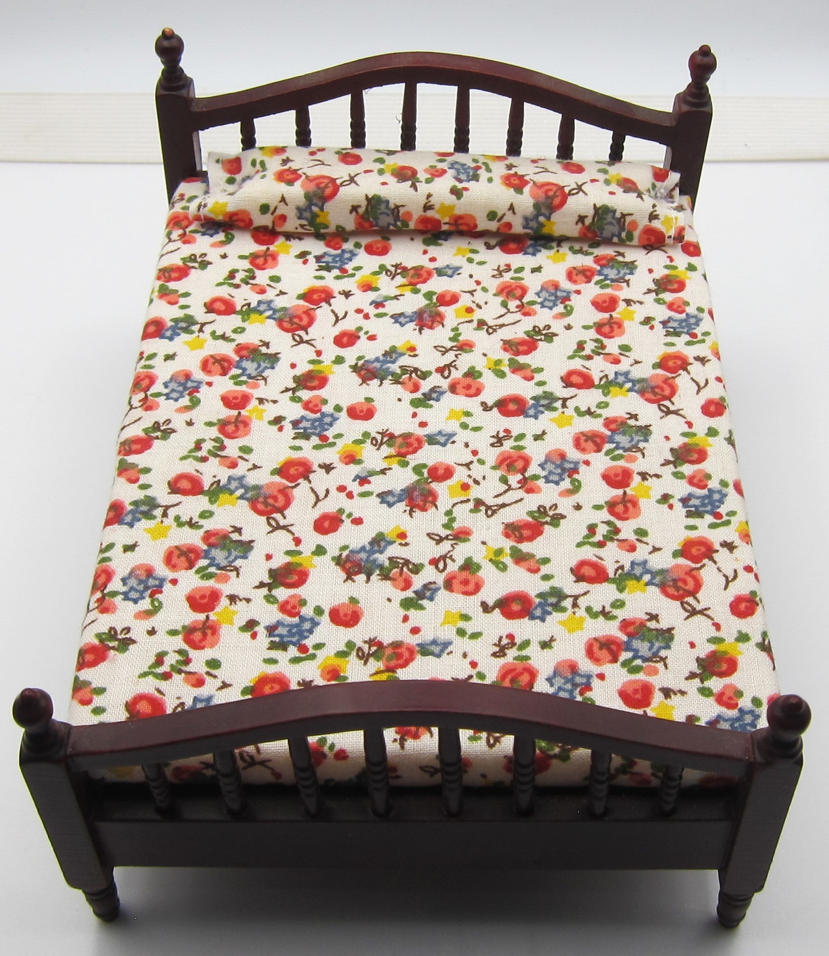 A large doll's bed. The bed frame is made from Mahogany wood. The bedding is white with flower patterns.