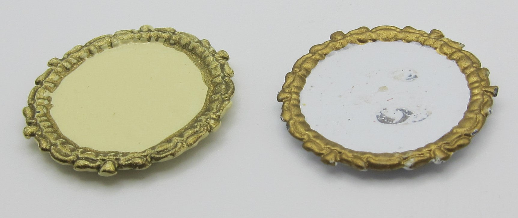 Two circular, white- with gold borders- food stands made of metal. 3,4 cm Diameter