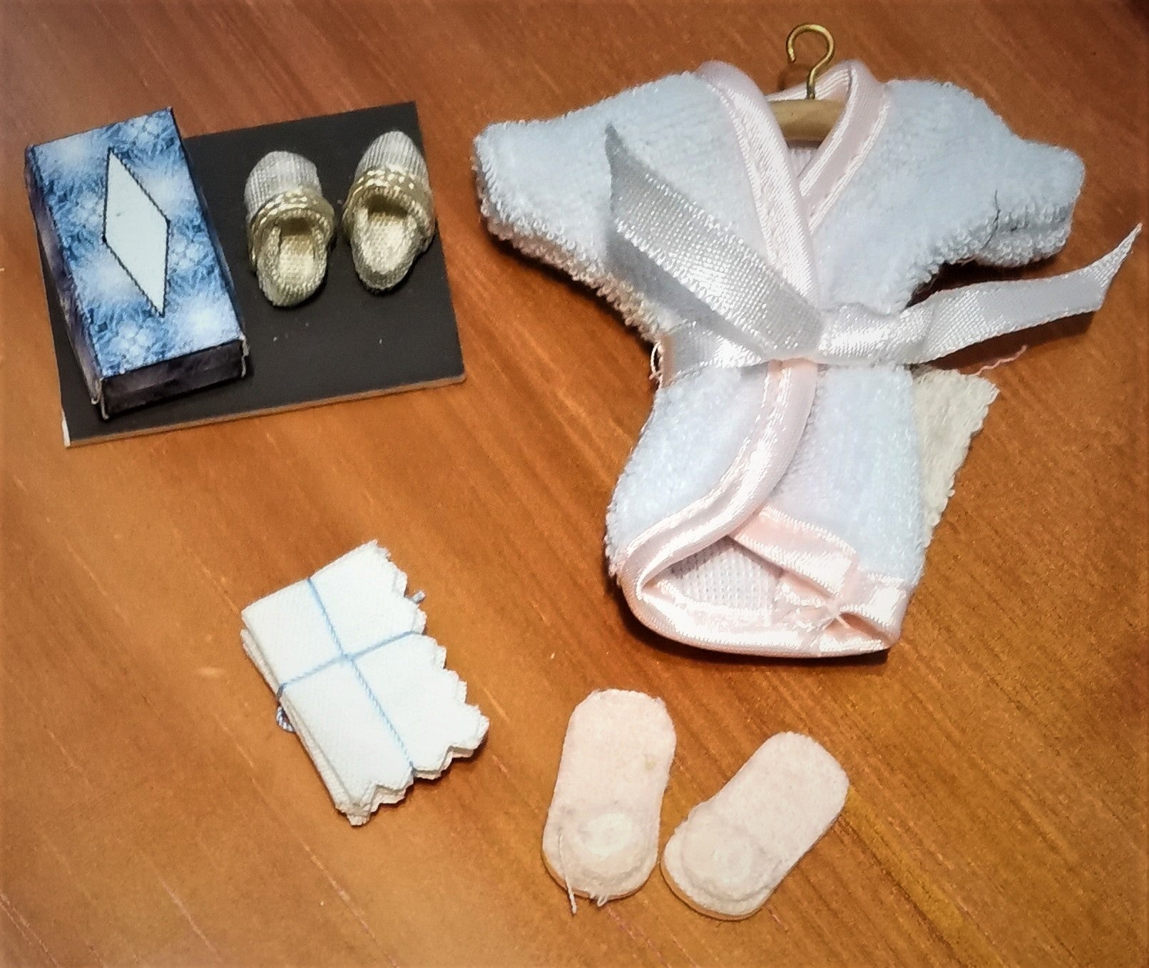 Spa toweling gown and slippers, tied with a silk ribbon and on a wooden hanger