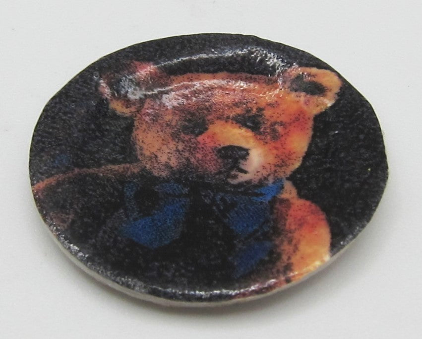 A paper, decorative plate with a picture of a teddy bear painted on.