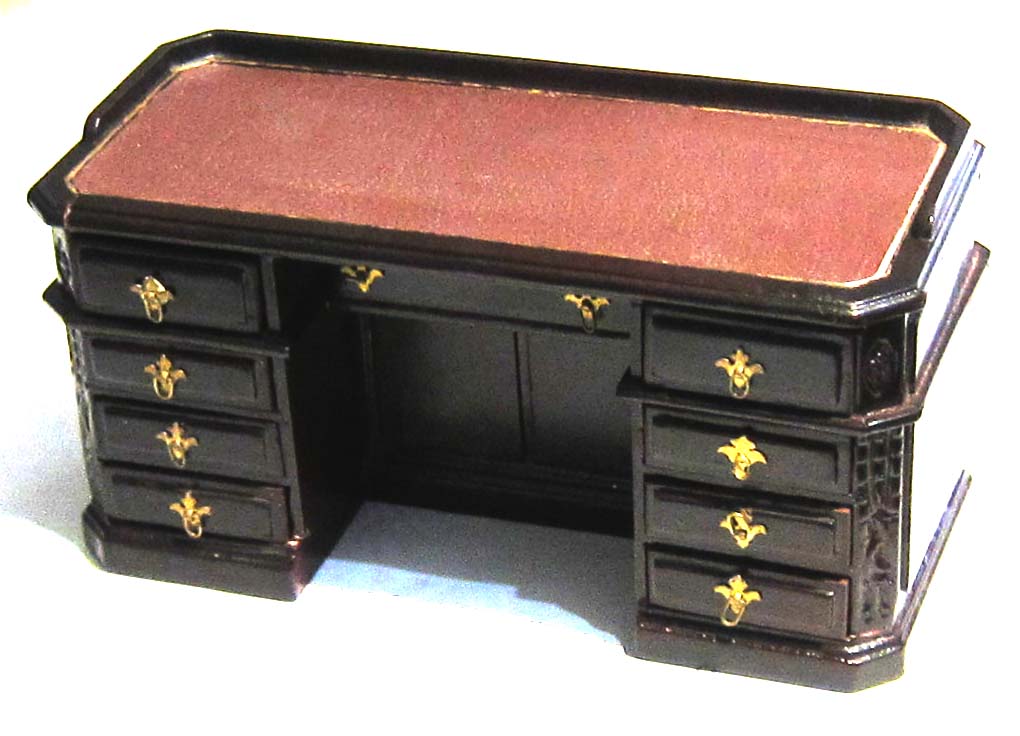 Knee hole desk - dark mahogany, 8 opening drawers, 1 non opener. unusual shape