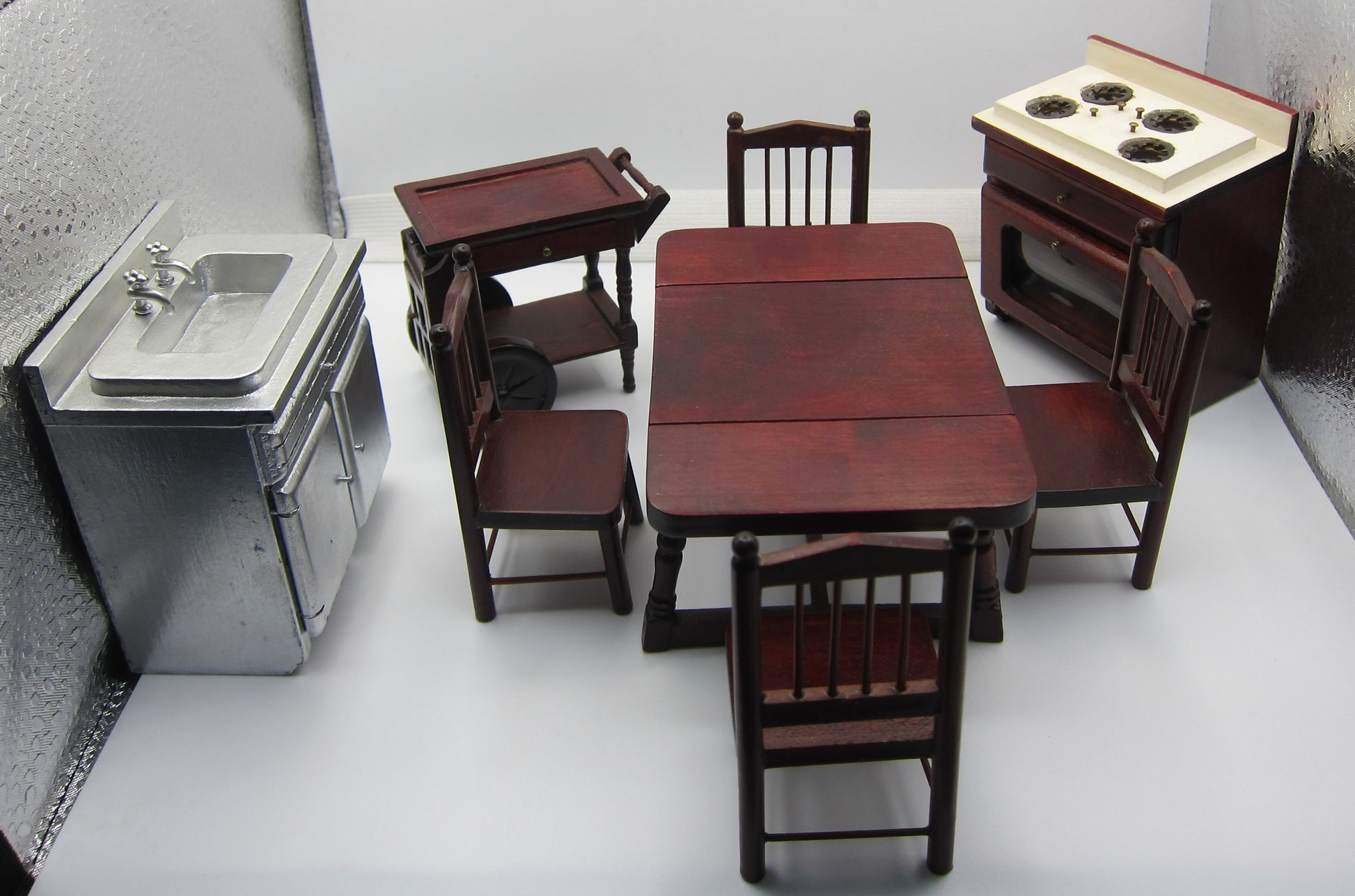 Plus a drop leaf with 4 matching chairs (1 is missing a foot peg), a serving trolley (opening cabinet and drawer)