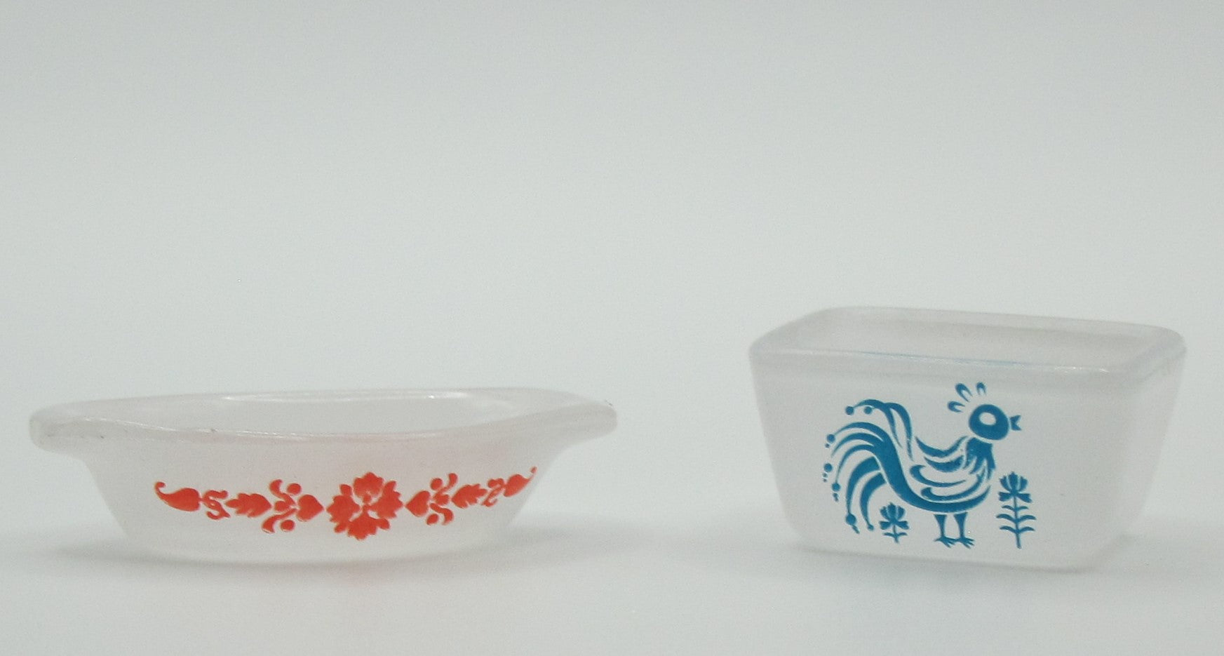 The other a more oval shaped dish with a beautiful floral pattern on the front
