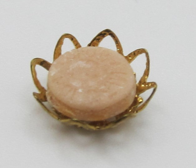 A gold-coloured, flower-shaped soap holder with a pink soap in it.