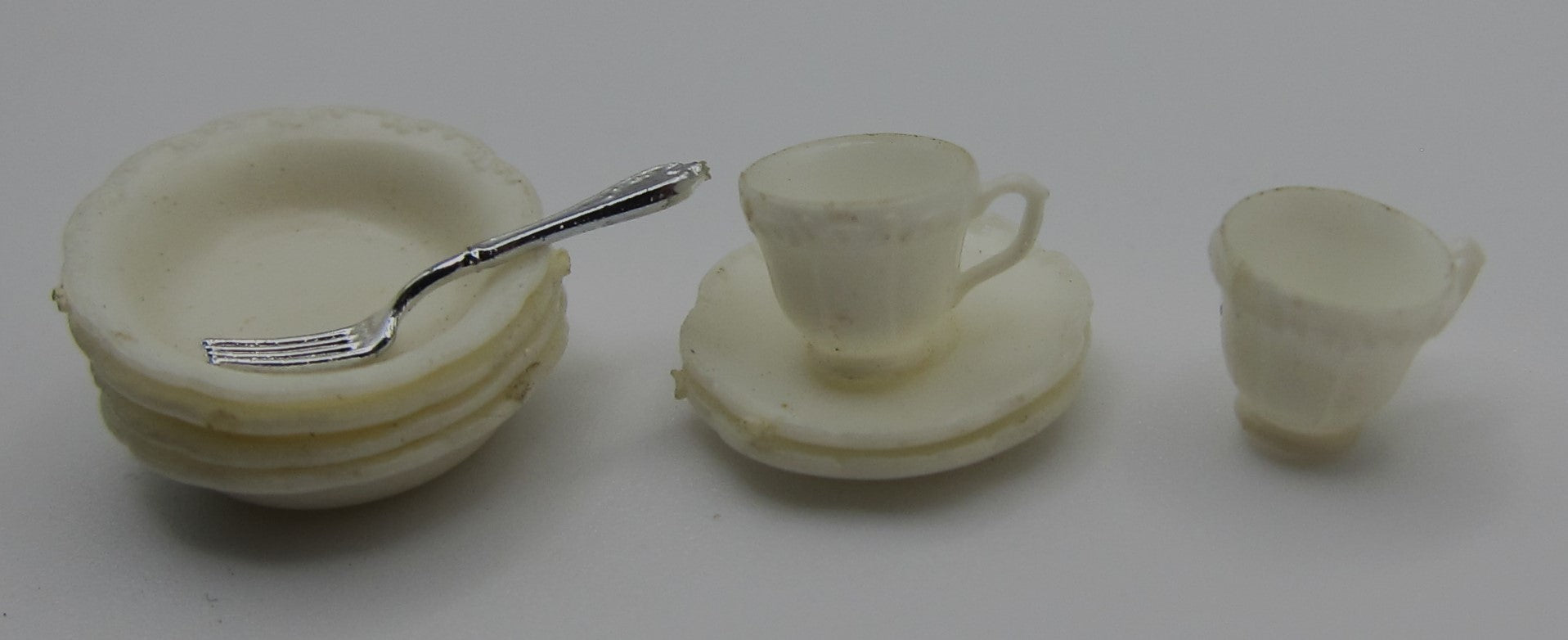 A pair of cups and saucers, a plastic, silver fork, and four cake plates.