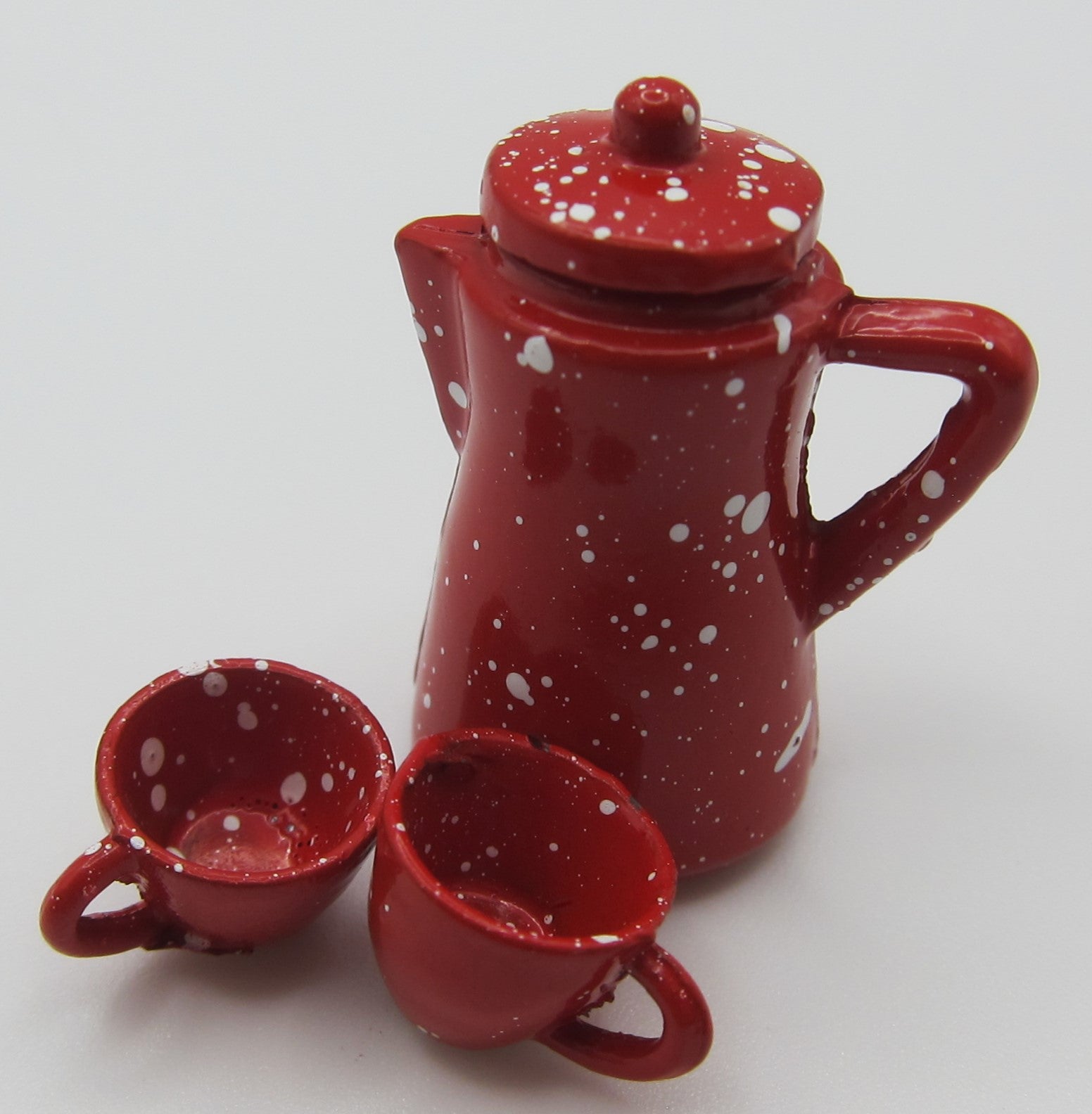 Red water jug (with a removable lid) & a pair of cups, with white speckles.