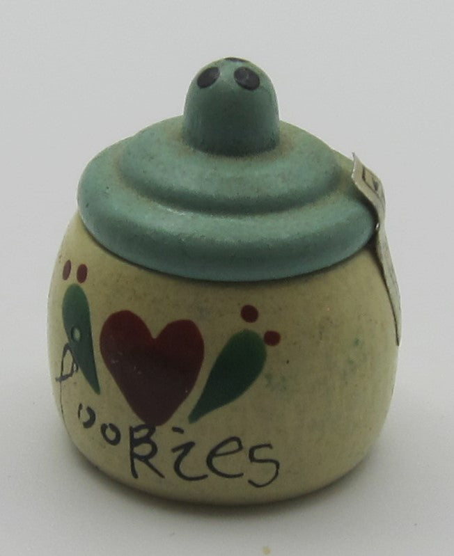 A white based, wooden jar, decorated with handpainted doodles, with a light blue lid. The jar can be opened.