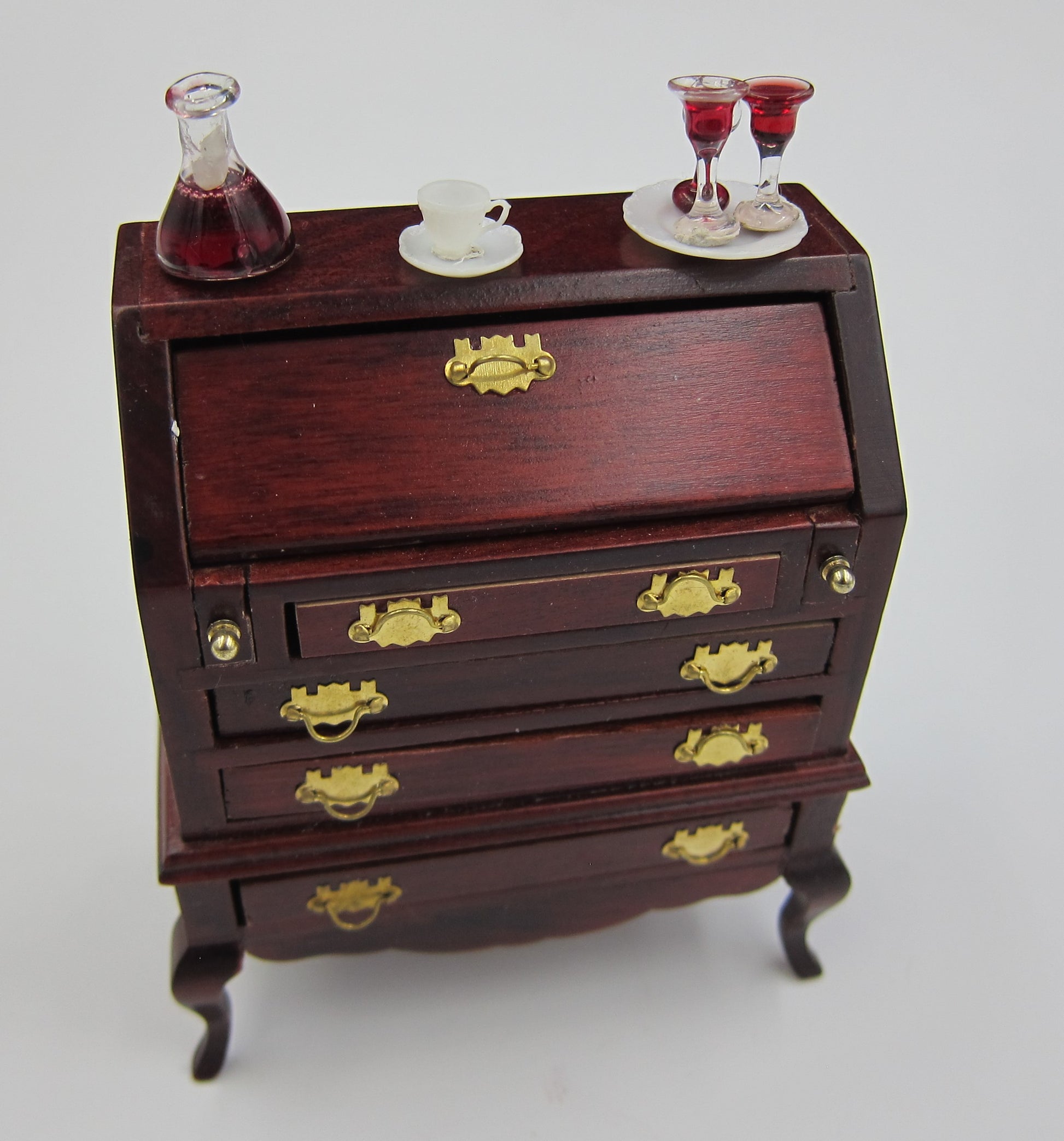 Mahogany writing desk.Bass handles with delicate wine glasses.